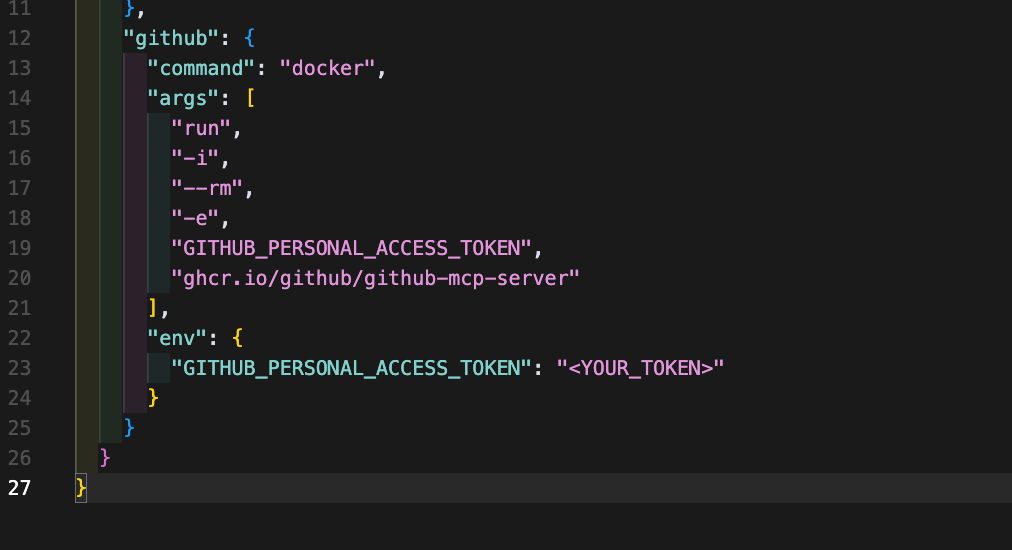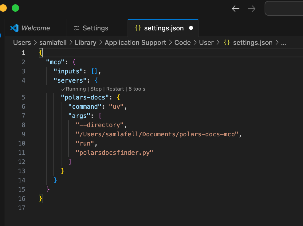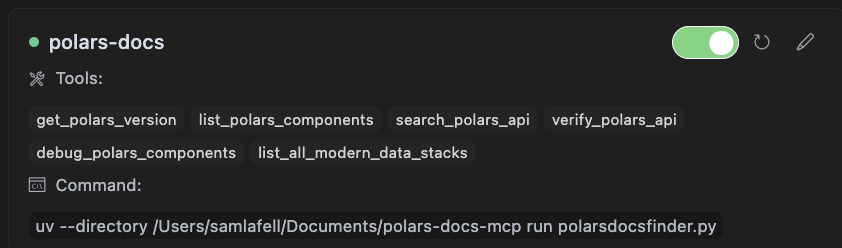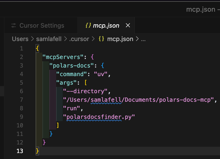 I just added this to my `mcp.json` where my Polars MCP Server is as well - and you'll notice here you need an environment variable. Different MCP servers will have different requirements for how you need to format them, and what you need to include.