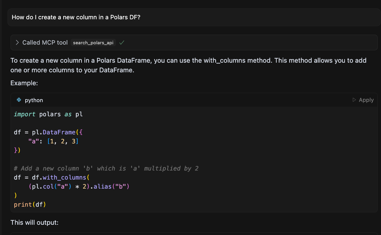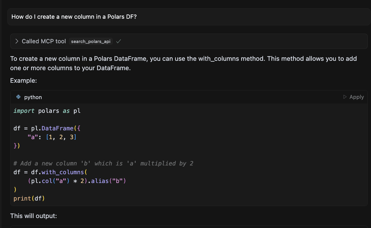Looks like it worked out alright, and these are definitely commands that work. I noticed two that LLMs used to get wrong all the time: `with_column, with_columns`, as they would spit out things without the underscore.