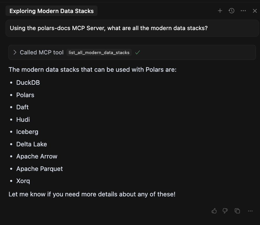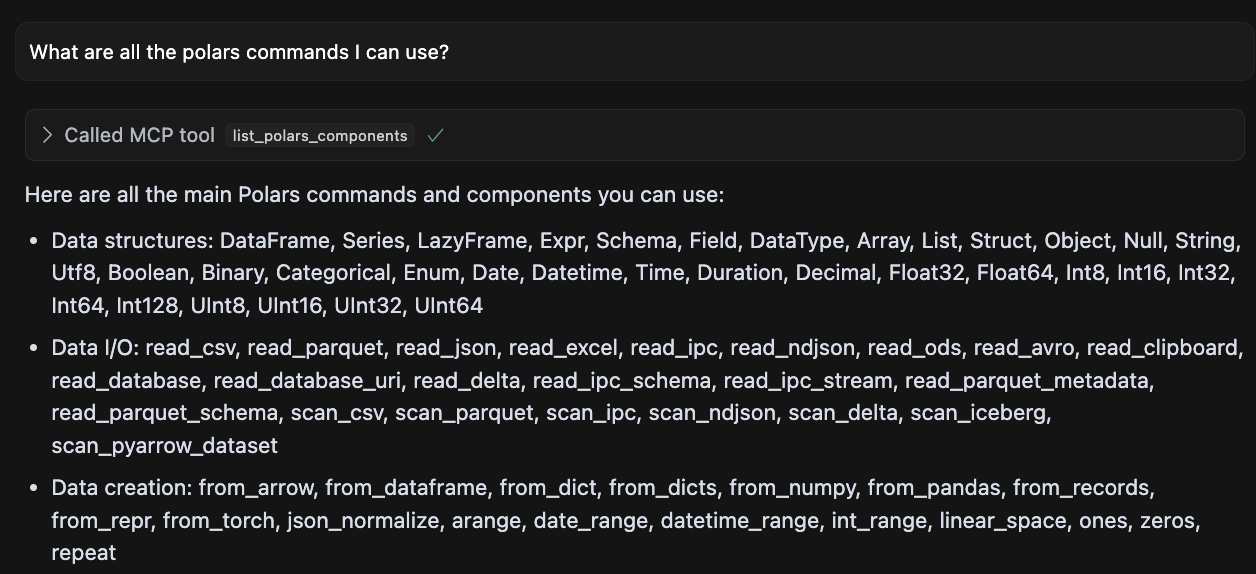 Here, I see all the different commands that are available using the Polars MCP Server.