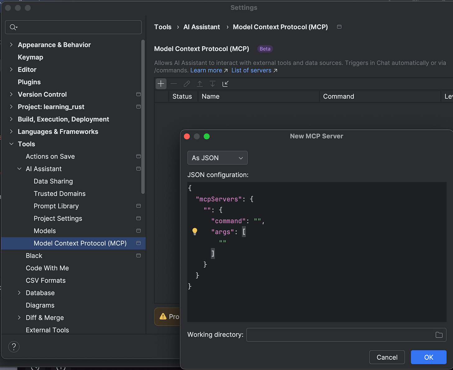 In Tools → AI Assistant → MCP, here you can add your MCP Server that you'd like to use.